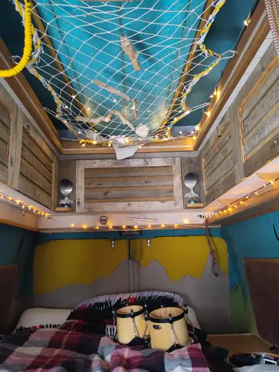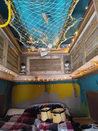 Gut laufender robuster Fünfzylinder Motor; schöner Innenausbau von mir als Tischler mit Armaflex Dämmung, Pappelsperrholzverkleidung und Wollfilz; Küchenspüle mit Zwei-Flammen-Gasherd; Truma Gasheizung Trumatic E 2400, externer Gasflaschen-Kasten; Frischwassertank mit Elektropumpe;
